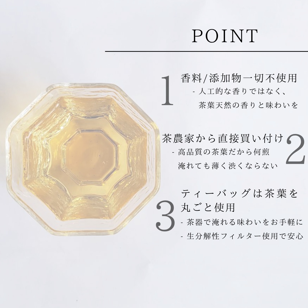 - 途中でお湯を足していただいても薄くならず最後まで味をしっかりとお楽しみいただけます。