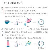 - 約500mlのボトルにティーバッグを1つ入れ、常温の水を注ぎ冷蔵庫でじっくり抽出します。6-8時間ほどでお召し上がりいただけます。